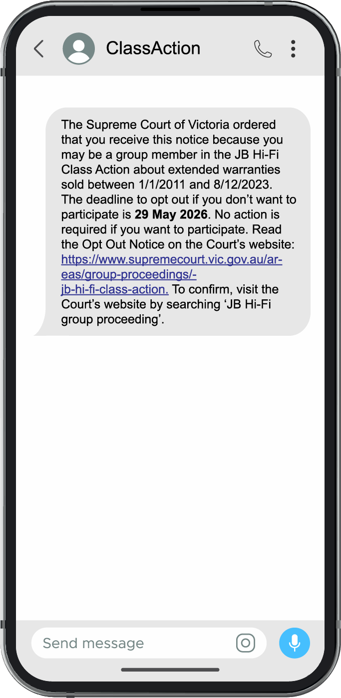 If you received an email from noreply@classaction.mauriceblackburn.com.au or an SMS from ClassAction about the JB Hi-Fi class action opt out notice, this is because JB Hi-Fi’s records show that you may have purchased an extended warranty between 1 January 2011 and 8 December 2023.